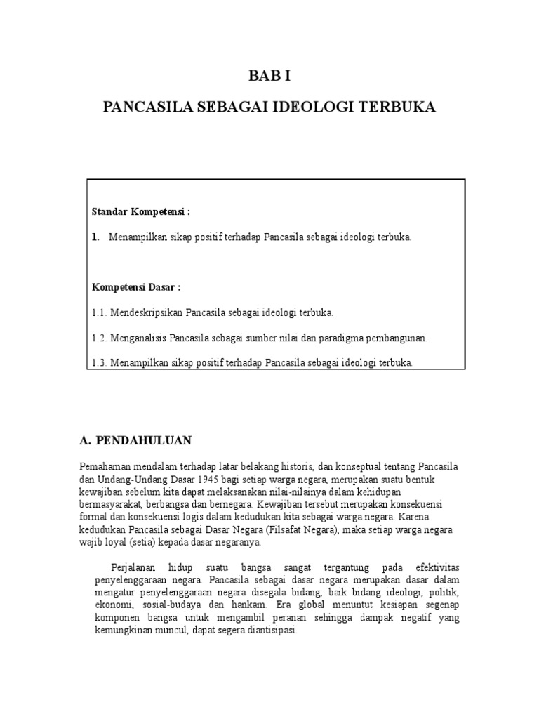 Bab I Pancasila Sebagai Ideologi Terbuka Standar Kompetensi 1