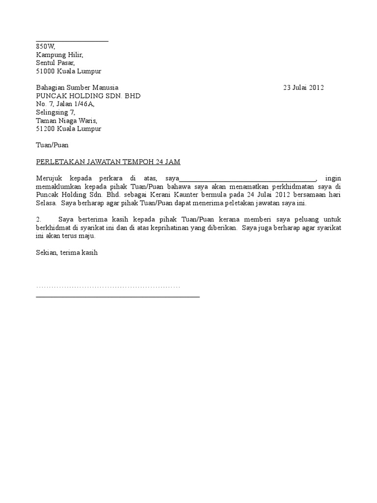 Contoh Surat Berhenti Kerja 24 Jam Bahasa Melayu Doylc Asia