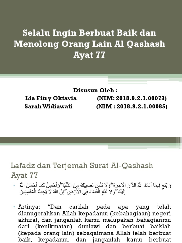 Surah al qasas ayat 77 beserta artinya. Tafsir quran surat al qashash ayat 77 77. Dan carilah pada apa yang telah dianugerahkan allah kepadamu kebahagiaan negeri akhirat dan janganlah kamu melupakan bahagianmu dari kenikmatan duniawi dan berbuat baiklah kepada orang lain sebagaimana allah telah berbuat baik kepadamu dan janganlah kamu berbuat kerusakan di muka bumi. Surah ini diturunkan di makkah setelah surah an naml dan terdiri dari 88 ayat. Maka musa alaihissalām merasa kasihan kepada keduanya dan mengambilkan.