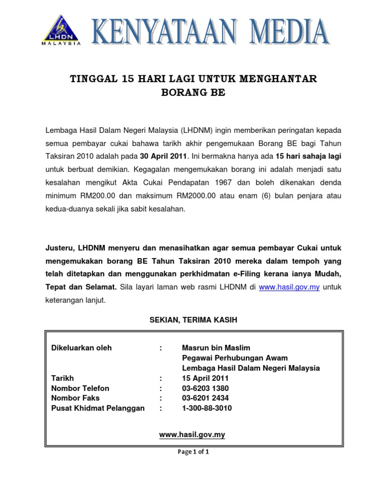 Tinggal 15 Hari Lagi Untuk Menghantar Borang Be Www Hasil Gov My