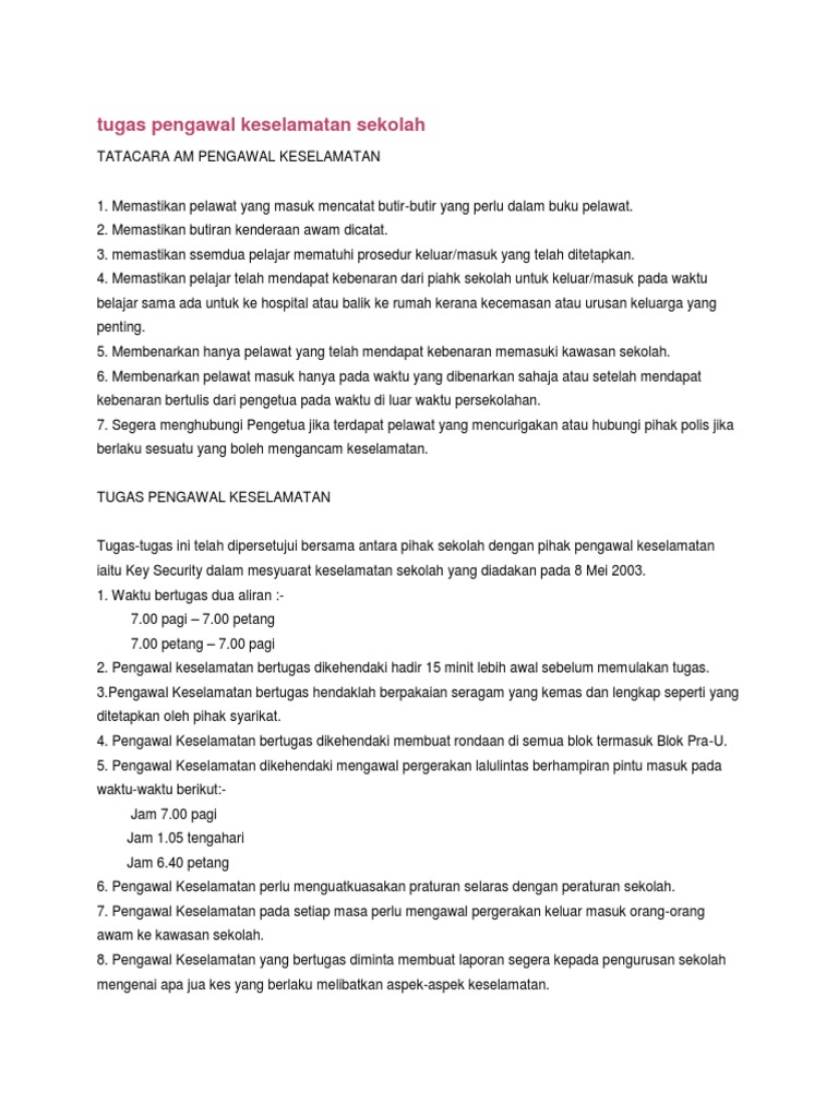 Tugas pengawal keselamatan sekolah. Memastikan semua pelajar mematuhi prosedur keluar masuk yang telah ditetapkan. Memastikan syarat syarat perjanjian dan bidang tugas berkaitan keselamatan sekolah dipatuhi oleh syarikat kawalan keselamatan sekolah. 2 memastikan keselamatan pengunjung dan pelawat yang melalui pintu utama untuk datang ke bukit bendera. Kursus asas pengawal keselamatan selepas hadir kursus ini insyaallah pengawal kita akan lebih bersemangat untuk kerja sebab mereka sudah tahu apa tugas tugas mereka kesan jika cuai dan paling utama mereka tahu mengapa setiap tugas itu perlu dilaksanakan dan bagaimana.