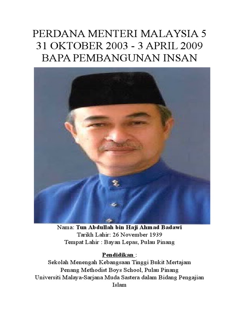 Biodata Tokoh Malaysia Biodata Tun Abdullah Bin Haji Ahmad Badawi Perdana Menteri Malaysia Ke 5