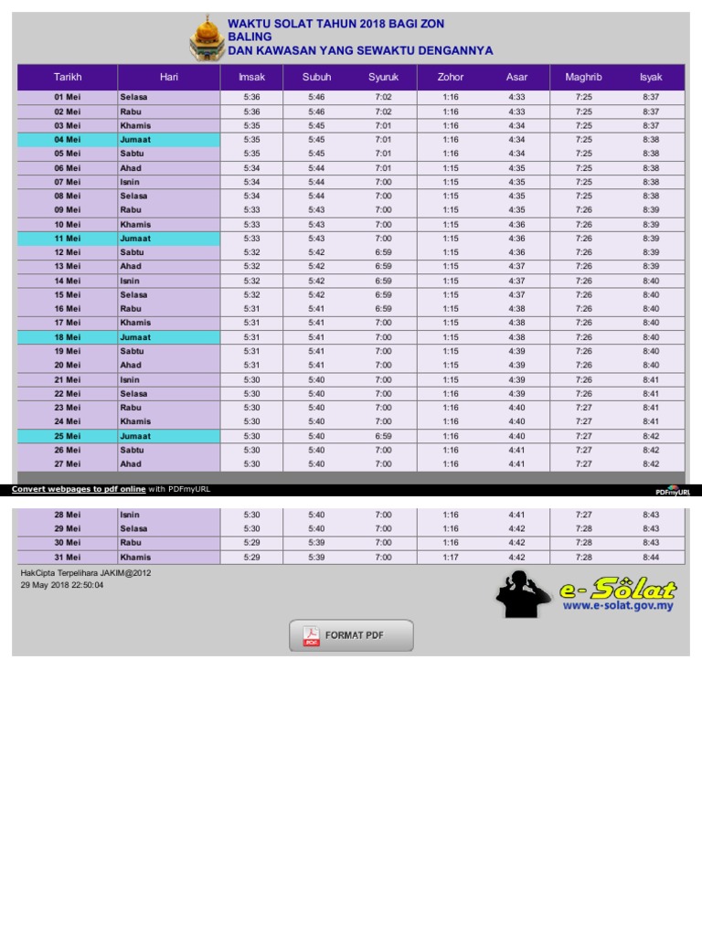 Waktu Solat Kawasan Yan Pendang Kedah Mei 2018